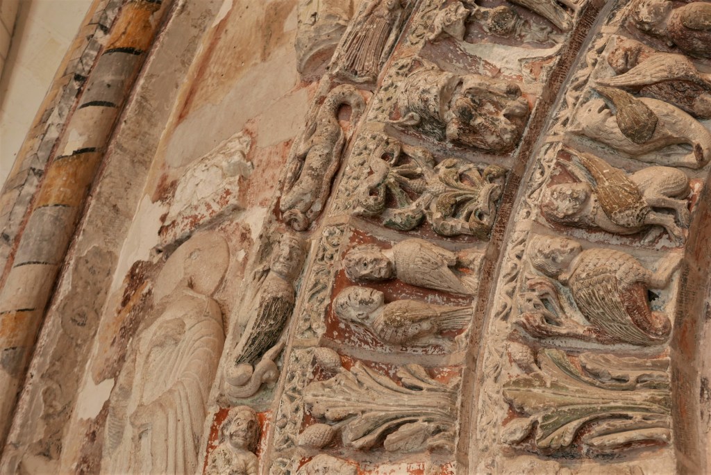 L’église Saint-Ours est encore ouverte, et je m’empresse d’y jeter un œil. (J’aime beaucoup le fait qu’il existe un Saint-Ours. Ça veut dire qu’Ours était un prénom à une certaine époque.) Construite dans la belle pierre blanche de la Loire, l’église est remarquable par ses drôles de pyramides sur le toit, comme un ours qui montre les dents, mais aussi par le riche bestiaire qui orne son portail roman. Malgré les dégâts du temps, quelques traces de peinture témoignent des couleurs vives qui animaient les monstres, les animaux et les saints du haut de leur tympan. Un charmant comité d’accueil.