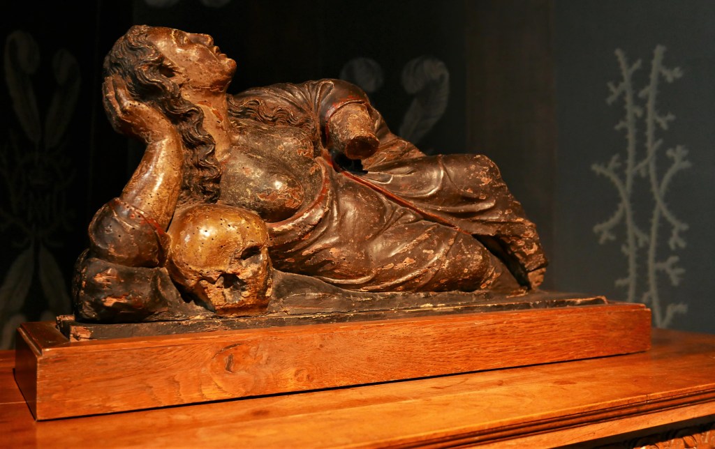 A l’intérieur de l’église, la nef est en travaux, mais on peut faire le tour par les allées latérales. Je découvre le tombeau d’Agnès Sorel, à qui le roi Charles VII avait légué le domaine de Loches. Joli cadeau pour sa favorite officielle, qui étonnait la cour par ses tenues et son maquillage extravagants – à tel point qu’elle éclipsait la reine, ce qui n’était pas une bonne idée. Agnès Sorel mourut à 28 ans de causes qui font encore débat (maladie ou assassinat, le mystère reste entier). Elle légua une grande partie de ses biens à la ville de Loches.