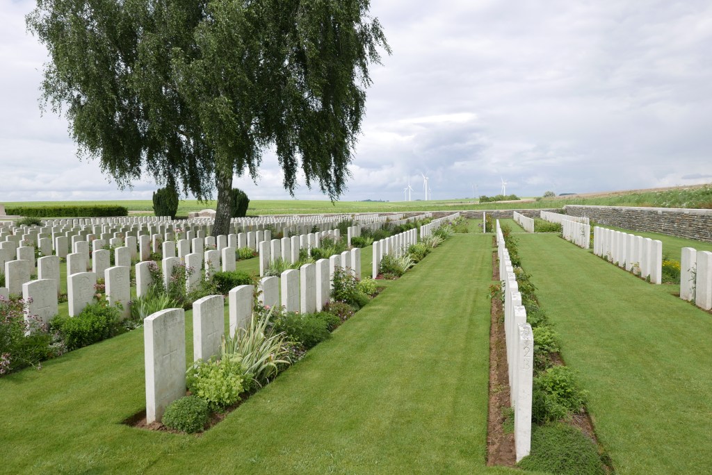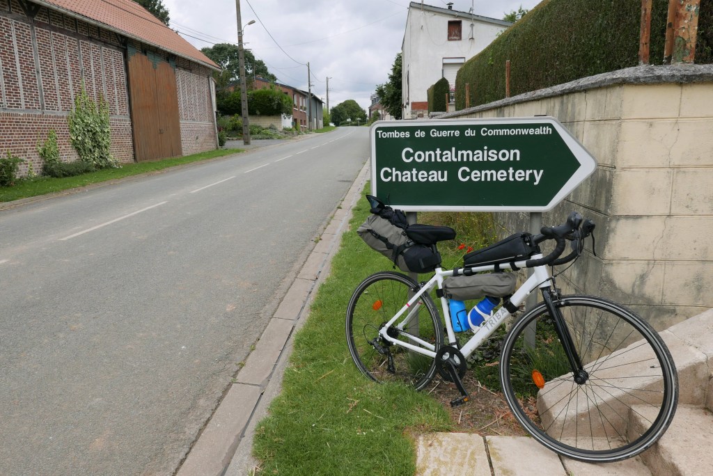 Après Arras, il faut faire une dizaine de kilomètres pour rejoindre une portion de voie verte. On est en plein territoire agricole, entre les champs et quelques élevages. Dès les premiers kilomètres, j’aime la liberté que donne le vélo, j’aime ce rythme où l’on profite des paysages sans s’ennuyer. Je traverse les villages aux grandes fermes de briques. Je pique-nique près d’une aire de jeux. A mesure que j’avance vers Gueudecourt, les panneaux indiquant les cimetières du Commonwealth se font plus fréquents. J’arrive dans cette campagne pas comme les autres, qui est ponctuée de lieux de mémoire liés au Royaume-Uni, mais aussi à la Nouvelle-Zélande, au Canada, à l’Australie ou à l’Afrique du Sud. Aujourd’hui encore, ces cimetières sont entretenus par la Commonwealth War Graves Commission.