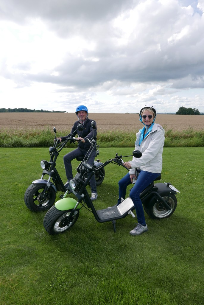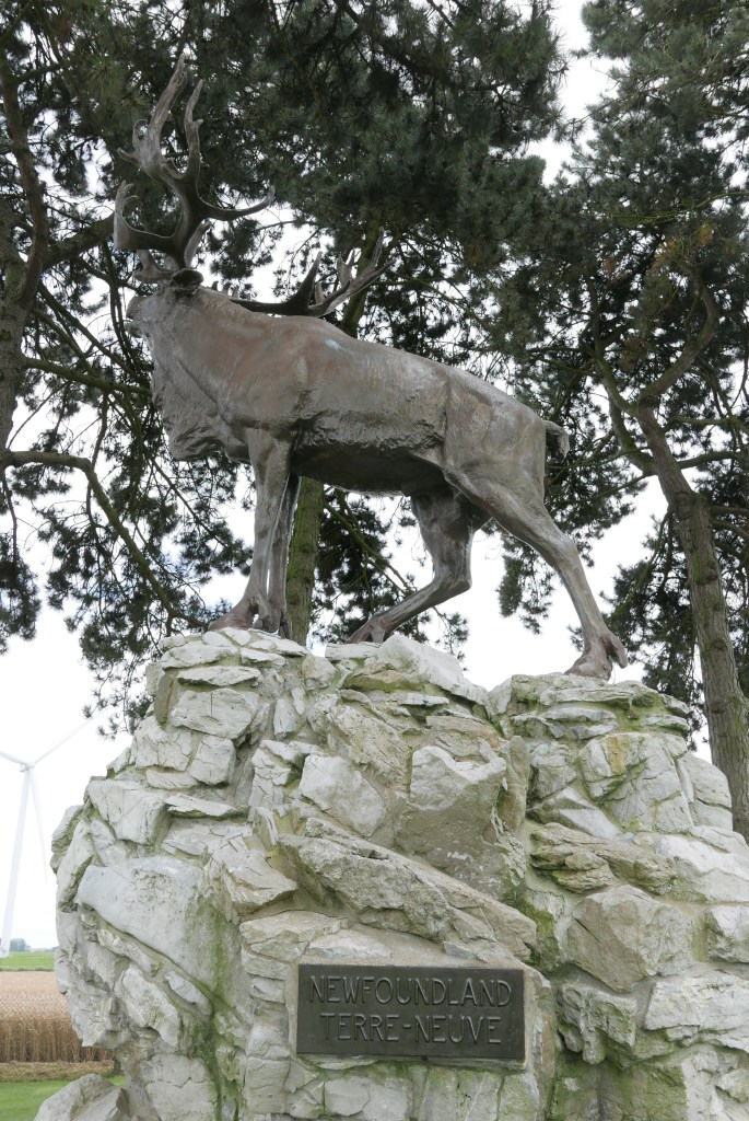 En fin d’après-midi, Philippe et Sylvie m’emmènent en balade en City-Coco, de drôles de scooters électriques. Je ne suis pas mécontente de changer de monture ! C’est parti pour une virée sur les petites routes à la découverte des lieux de mémoire des environs. Nous saluons d’abord le caribou de Gueudecourt, qui rend hommage aux soldats terre-neuviens.