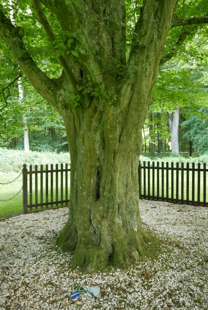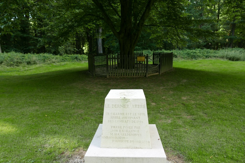 Derrière le mémorial, un arbre est isolé et protégé : il s’agit d’un charme qui a justement survécu aux combats et aux bombardements. Un arbre témoin. C’est simple et très émouvant, car cela nous rappelle que nos conflits n’ont pas seulement un impact terrible sur les humain.e.s et qu’ils ont aussi un impact très fort sur l’environnement et la nature.