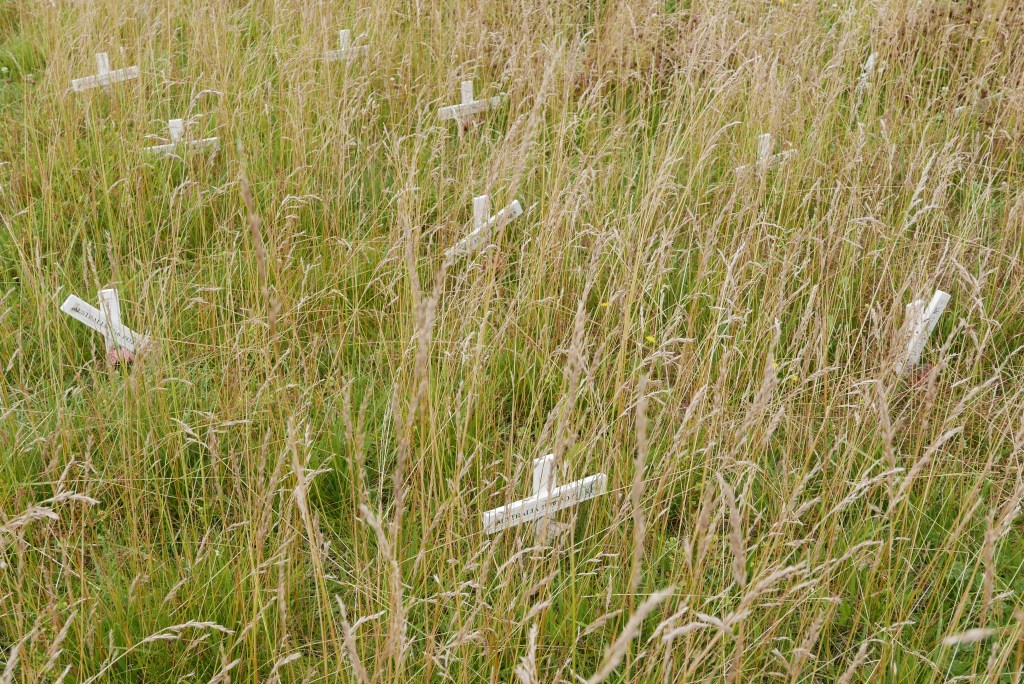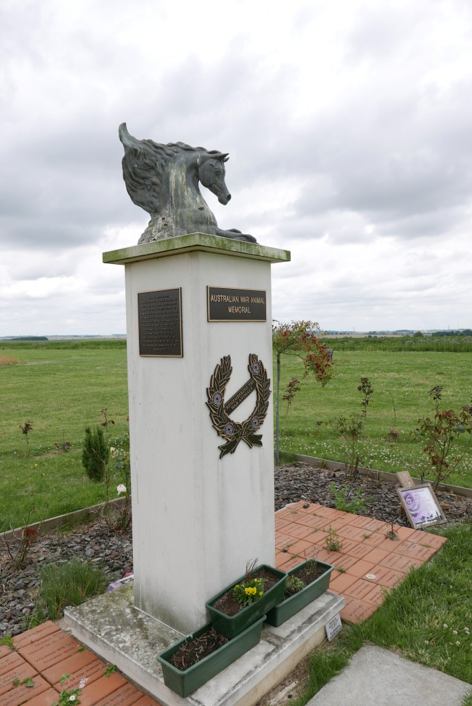 Derrière le mémorial de Windmill se trouve un autre mémorial. Il est un peu de bric et de broc, moins solennel. On y voit une statue de cheval, une autre de chien. C’est le mémorial aux animaux victimes de la guerre, le seul du genre qui existe en Europe. Tout autour du site, des petites croix blanches sont plantées dans le sol parmi les herbes hautes.