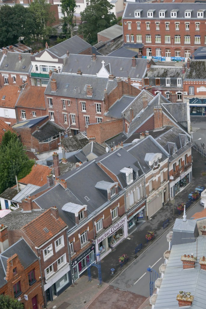A l’intérieur, j’ai particulièrement aimé les trois statues de la sculptrice Anne-Marie Roux, dans un style épuré et moderniste. Nous avons ensuite grimpé les marches jusqu’en haut du clocher pour avoir une vue sur Albert et ses environs. La ville, toute de briques vêtue, se déploie à nos pieds. De retour au sol, je me balade entre l’hôtel de ville et la gare pour admirer les innombrables détails Art Déco qui ornent les bâtiments : balcons en fer forgé, moulures végétales, façades tronquées pour éviter les angles droits, motifs géométriques… Un vrai régal !
