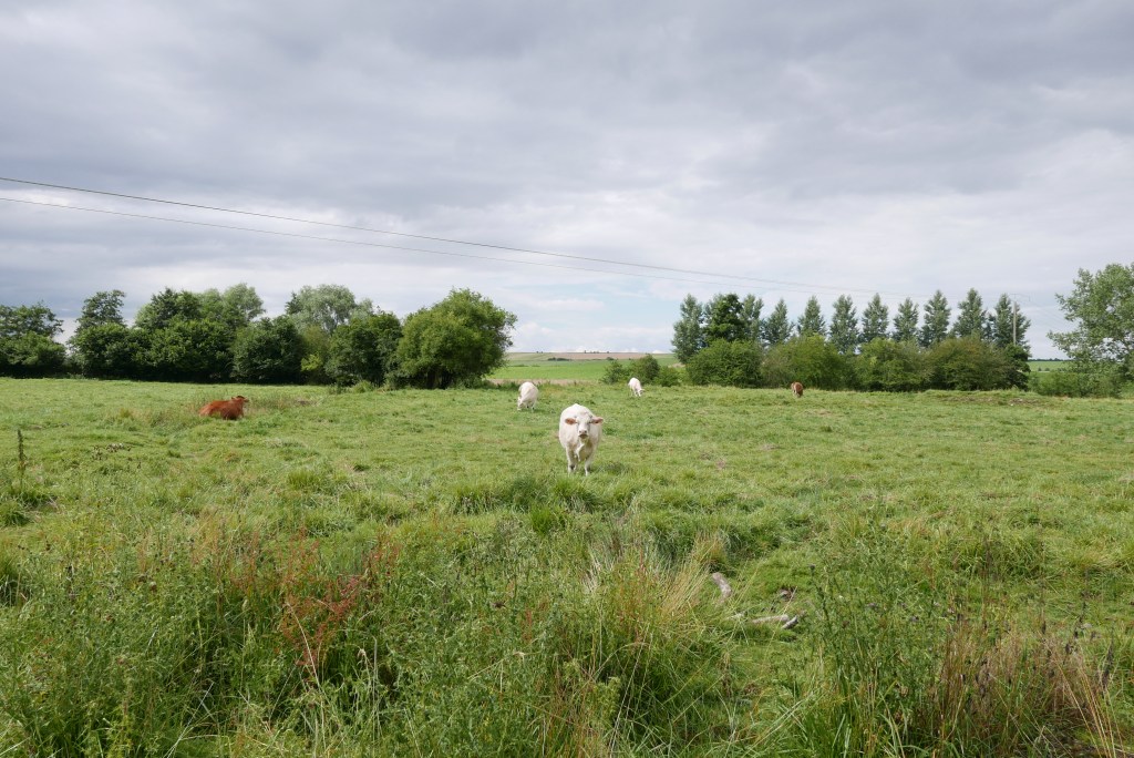 La Véloroute suit plus ou moins la vallée de l’Ancre à travers de jolis villages et des champs. Je fais coucou aux vaches ou aux chevaux, m’abrite sous un hangar de tracteurs quand une nouvelle averse arrive. La météo est taquine et les montées paraissent encore plus longues sous la pluie ! Au final, le ciel se lève quand j’arrive aux environs de Corbie, où l’Ancre et la Somme se rejoignent. A partir de là, le tracé de la Véloroute de la Mémoire rejoint celui de la Véloroute de la Somme. Je n’ai pas fait d’arrêt sur cette portion entre Albert et Vecquemont, mais il y a encore ici et là des cimetières britanniques au milieu des champs.