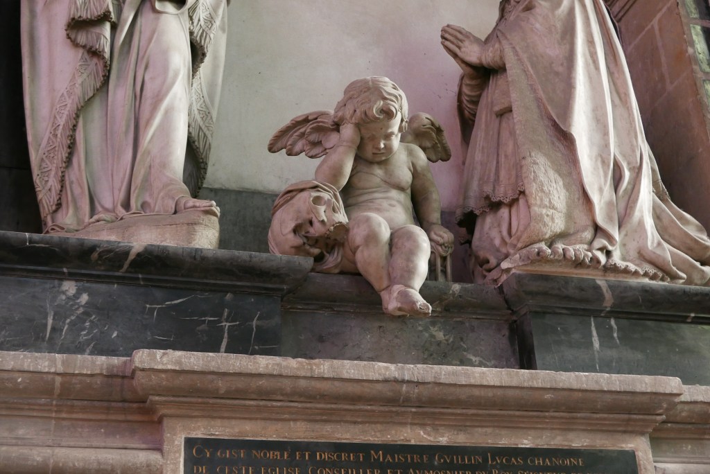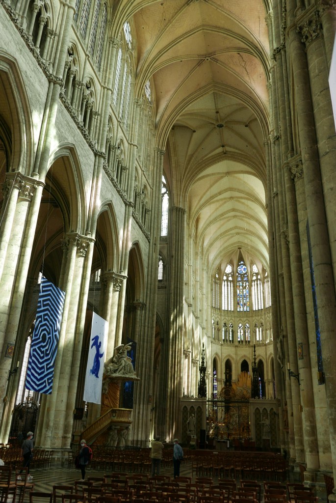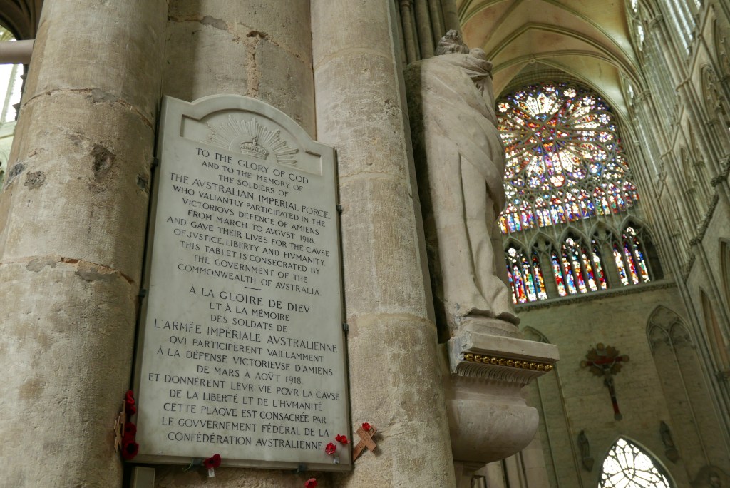 Pour finir en beauté, je rejoins Sébastien, du service Ville d’Art et d’Histoire d’Amiens, pour une visite de la cathédrale sur la thématique de la Première Guerre mondiale. Sébastien est passionné par ce sujet depuis les commémorations du Centenaire et c’est un plaisir de l’écouter raconter les anecdotes qui ont marqué ce lieu sublime pendant cette terrible période. Il me montre une petite croix au sol qui signale l’endroit où un obus s’est planté ainsi que les plaques commémoratives et les drapeaux du Commonwealth. Il évoque les orgues et leur évacuation rocambolesque, les vitraux qui ont survécu à la guerre et qui ont brûlé dans un atelier du Faubourg Saint-Antoine. Il décrit les sacs de terre qui ont été utilisés pour protéger la façade et les stalles. La visite est animée, vraiment chouette. J’apprends beaucoup et c’est une excellente manière de boucler ce périple à vélo sur les lieux de mémoire de la Somme.