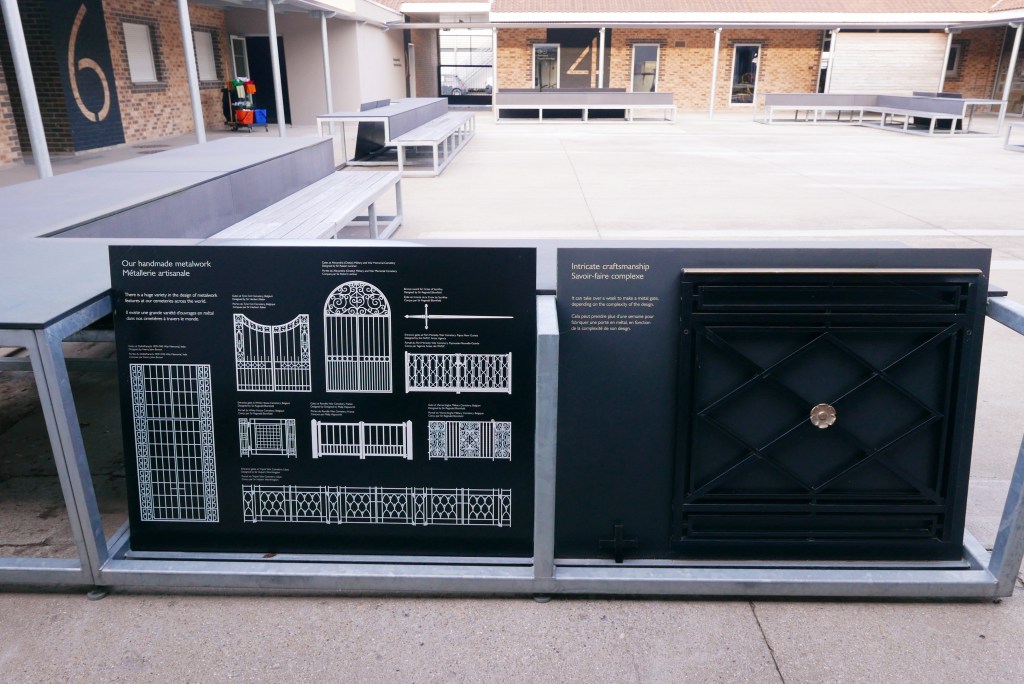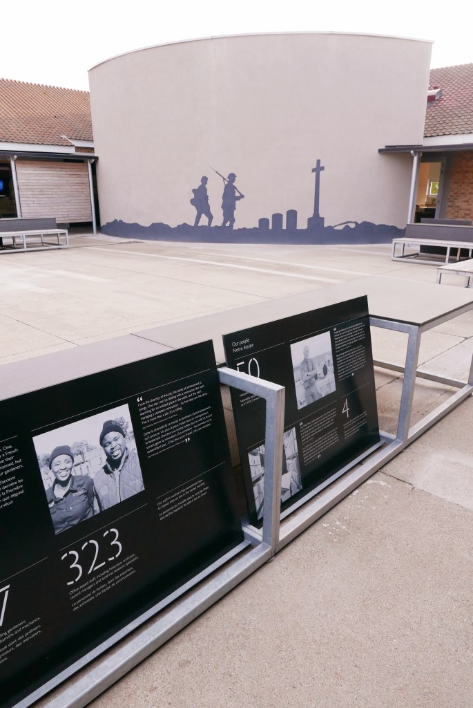 C’est vraiment intéressant de voir des échantillons des matériaux qui sont utilisés pour faire les stèles et de comprendre qu’aucun détail n’est laissé au hasard. La police d’écriture, par exemple, a été choisie pour être visible à deux mètres de distance. Les stèles ont le haut arrondi pour que la pluie s’écoule par le côté et non sur le devant. Les portails, les bancs et les boites à registre font aussi l’objet d’une grande attention. Et tous les panneaux signalétiques de la CWGC, ces panneaux sur fond vert qui ponctuent notamment la campagne de la Somme ou de la Flandre belge pour indiquer les cimetières, sont fabriqués ici à Beaurains.