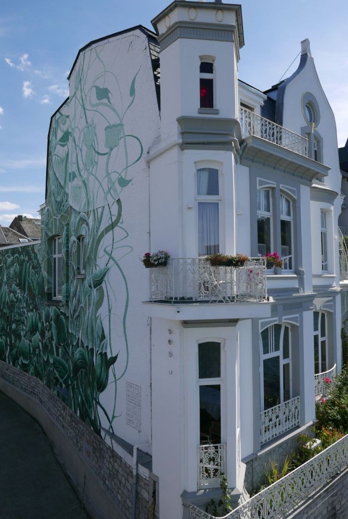 Je traverse la Meuse sur l’Enjambée, une passerelle piétonne, et découvre la grande fresque de Démosthène qui encanaille la bourgeoise Villa Balat de ses motifs végétaux. Je fais ensuite un bon tour de la ville, en mode chasse aux trésors, pour découvrir les autres œuvres du parcours : une machine à écrire et des VHS sur le bâtiment des Archives (œuvre de Léon Keer), un nuancier de béton multicolore sur le chemin de l’école (œuvre de Propaganza) ou un lettrage un peu steampunk sur le mur d’un lycée technique (œuvre de Démosthène et Maxime Lambert).