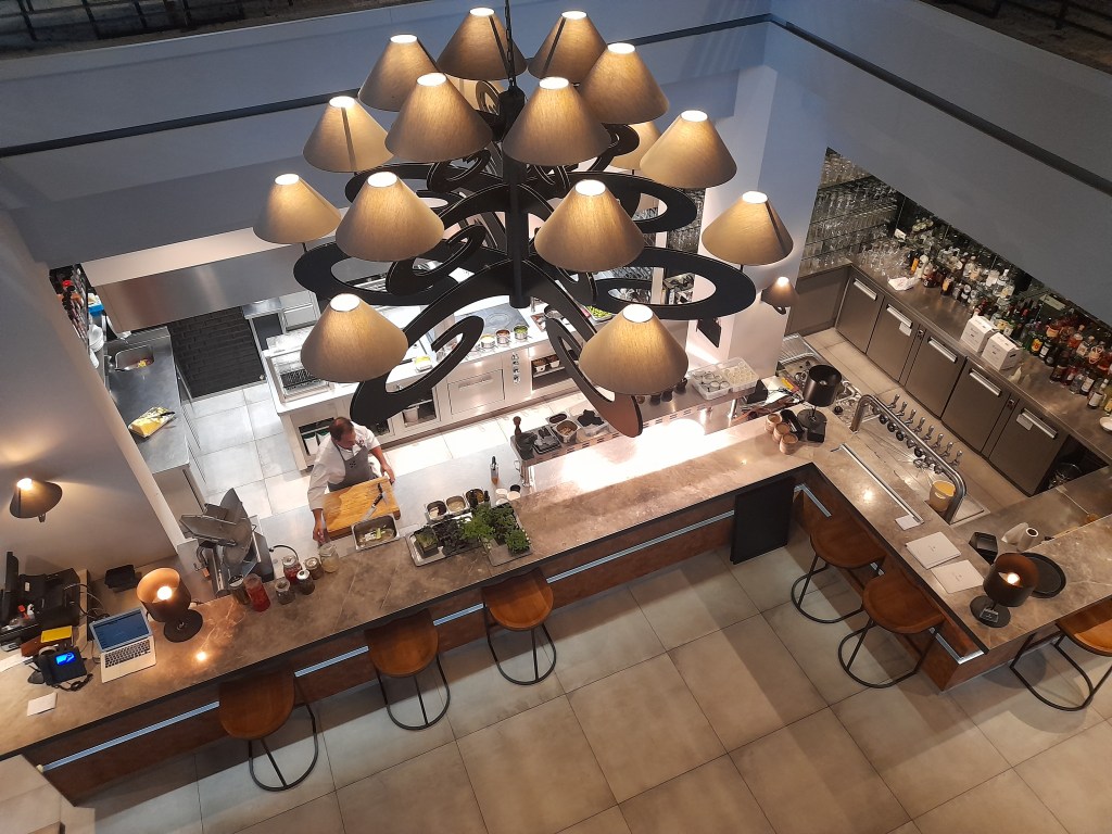 J’y ai diné le premier soir avec Martine, et c’est un endroit bien connu des Carolos. Un grand bâtiment de béton et de verre situé sur les bords piétons de la Sambre accueille ce lieu hybride dédié au cinéma, au gaming et à la bonne chère. Le restaurant est spacieux, animé, avec une belle terrasse sur le quai.