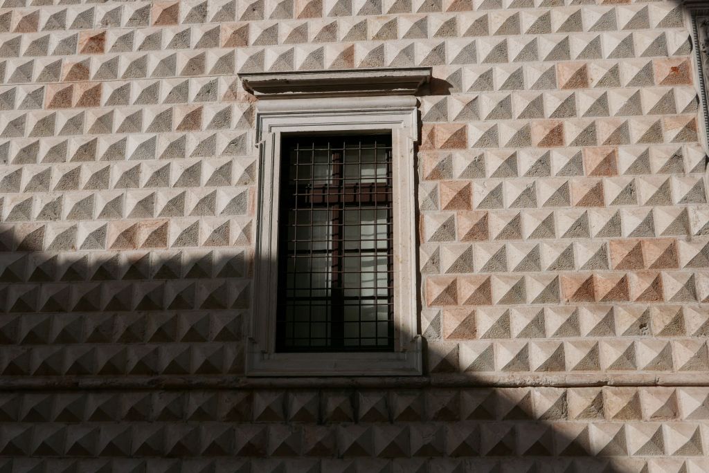 Voici quelques mots de Bassani pour vous accompagner le long de cette avenue qui longe le palais Diamanti. Ce bâtiment à la façade si particulière abrite la Pinacothèque nationale, où nous avons admiré de magnifiques tableaux religieux des époques médiévale et Renaissance. C’est un immense plaisir de déambuler dans les salles presque vides ornées de toutes ces toiles aux couleurs vives et aux motifs souvent étonnants ou étranges. La promenade se poursuit sur les pavés de cette large avenue bordée d’arbres jusqu’au parc Giorgio Bassani. Nous nous perdons dans les petits chemins adjacents qui serpentent autour des remparts et qui longent de minuscules fermes. Nous sommes tout près du centre, mais cette partie de la ville a un air bucolique.